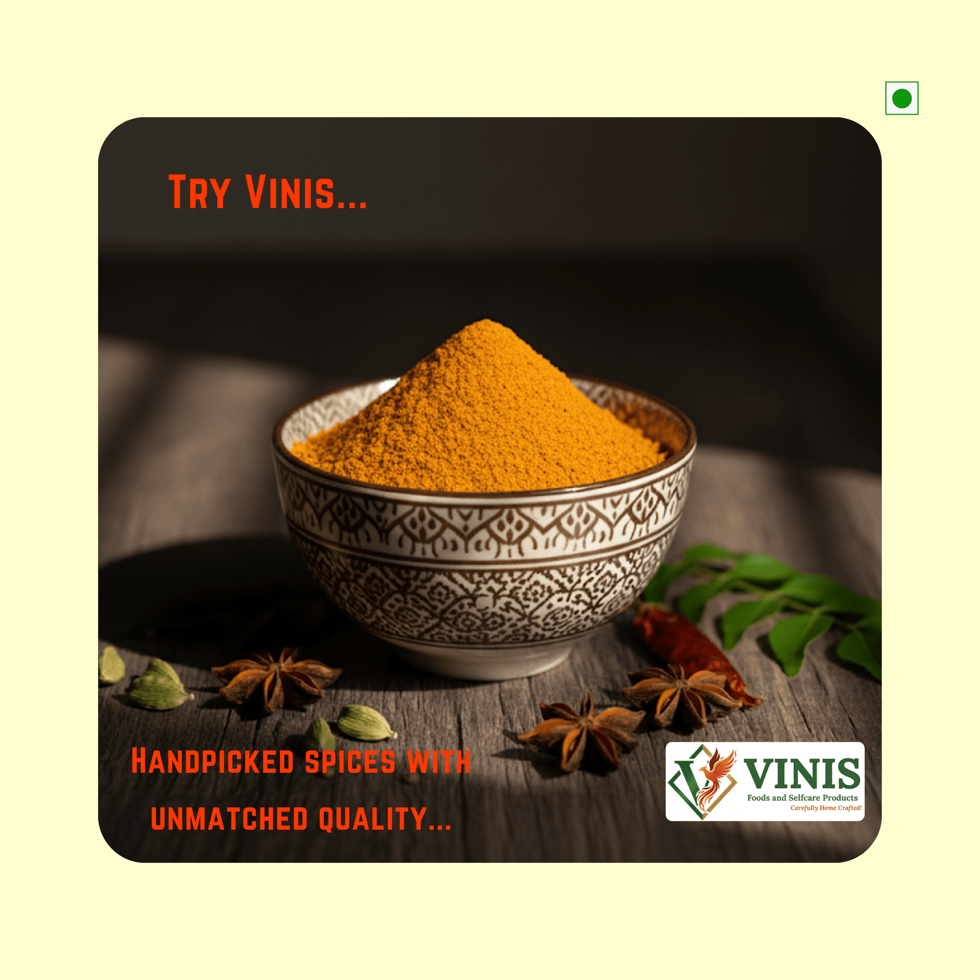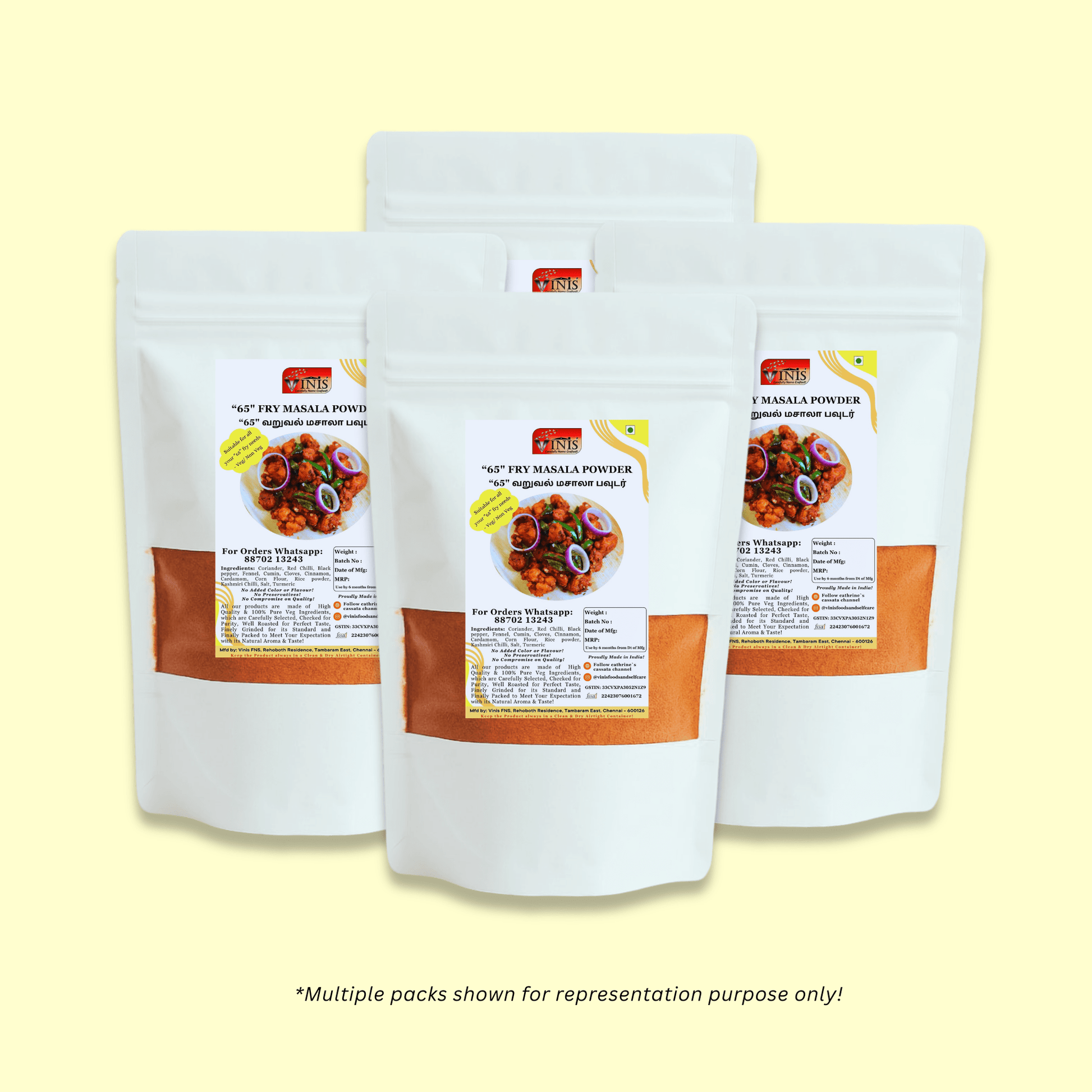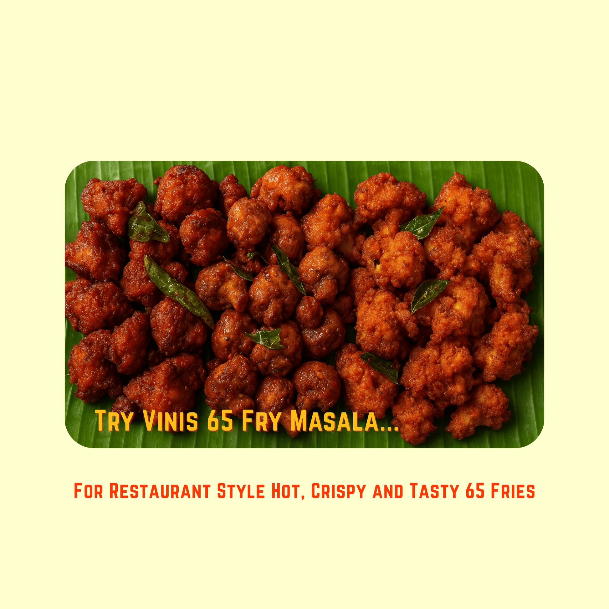 VINIS “65” Fry Masala Powder is a perfectly balanced spice blend crafted to make restaurant-style Chicken 65, Paneer 65, Mushroom 65, or Veg 65 right at home. With a rich mix of premium spices, it brings authentic taste, aroma, and vibrant color to your fry dishes — without artificial flavors or colors.