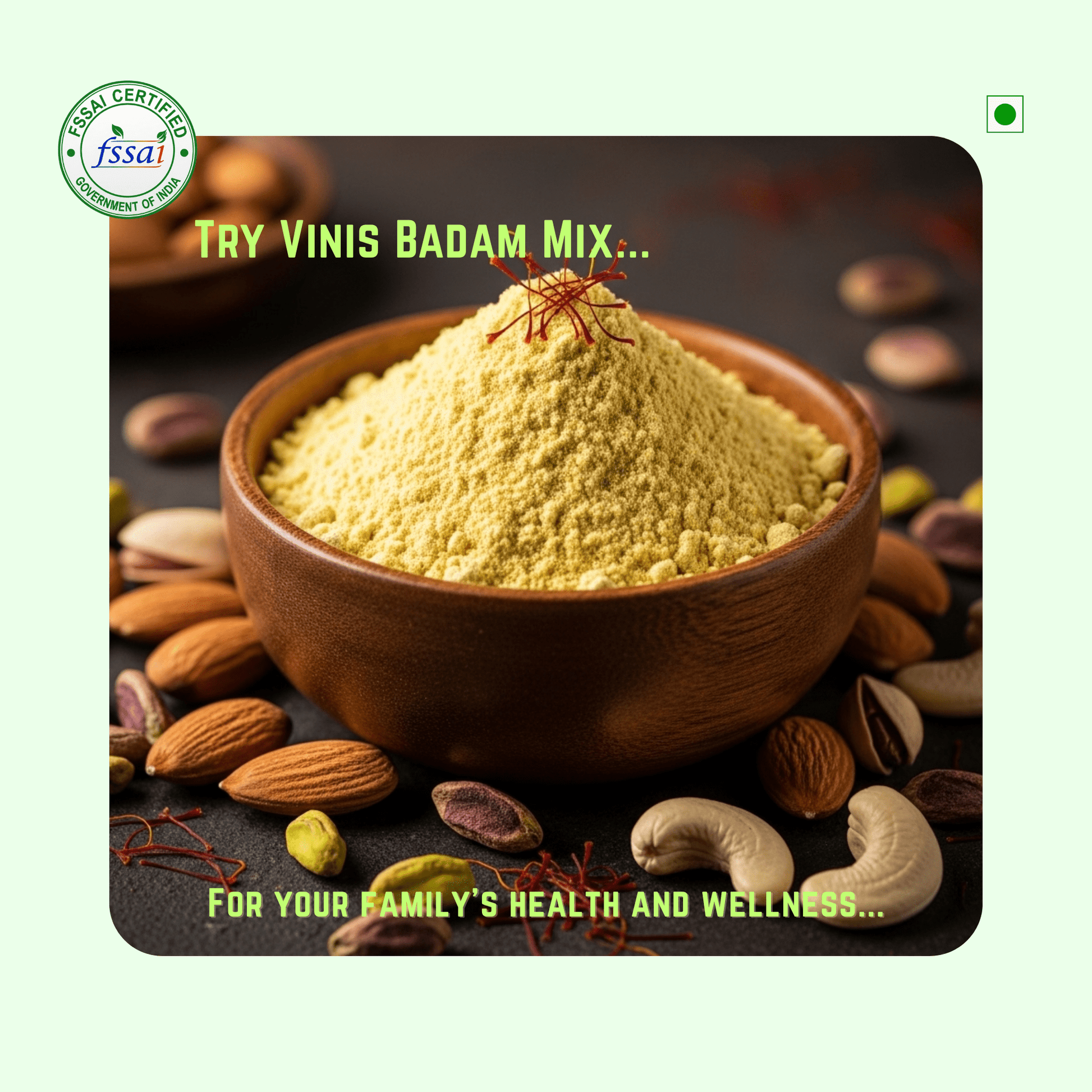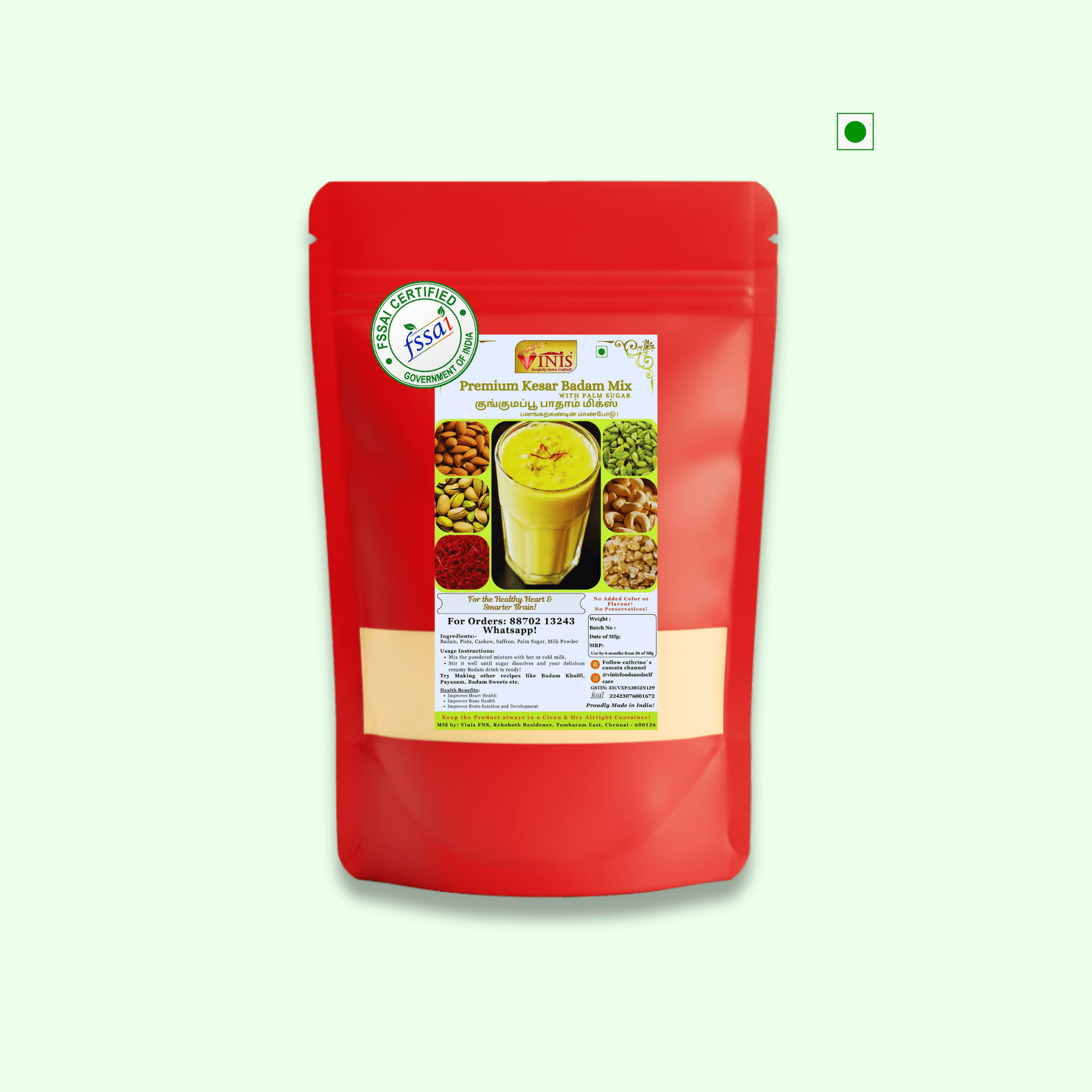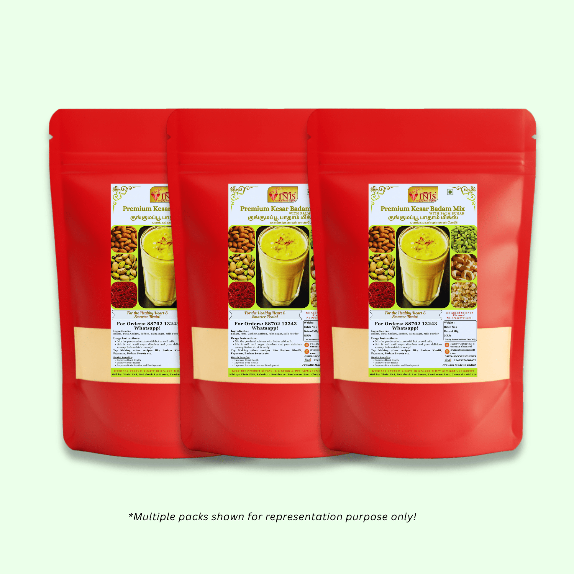 VINIS Premium Kesar Badam Mix is a royal blend of rich dry fruits, pure saffron, and natural palm sugar — crafted to deliver taste, health, and tradition in every sip. This nourishing mix combines the goodness of almonds, pistachios, and cashews with the golden touch of kesar (saffron), offering a delicious, energy-boosting drink for the whole family.