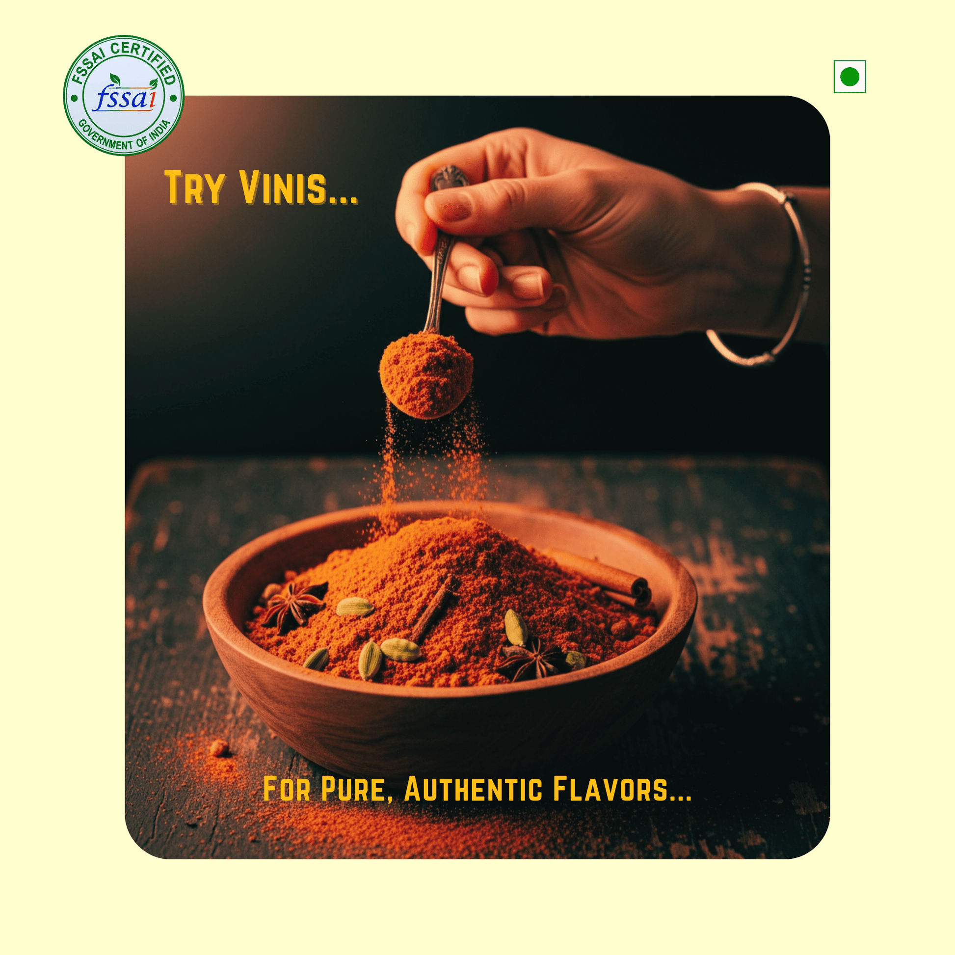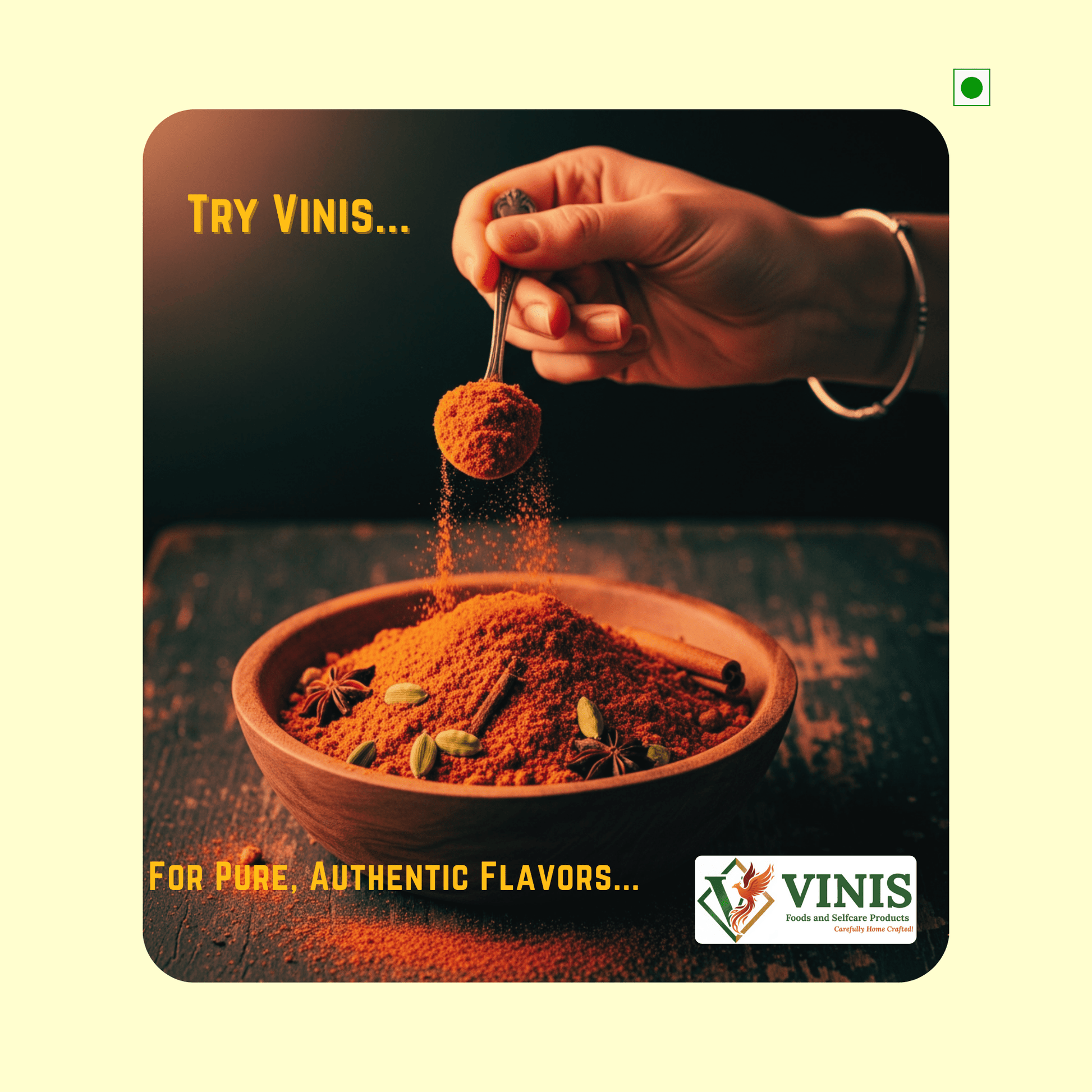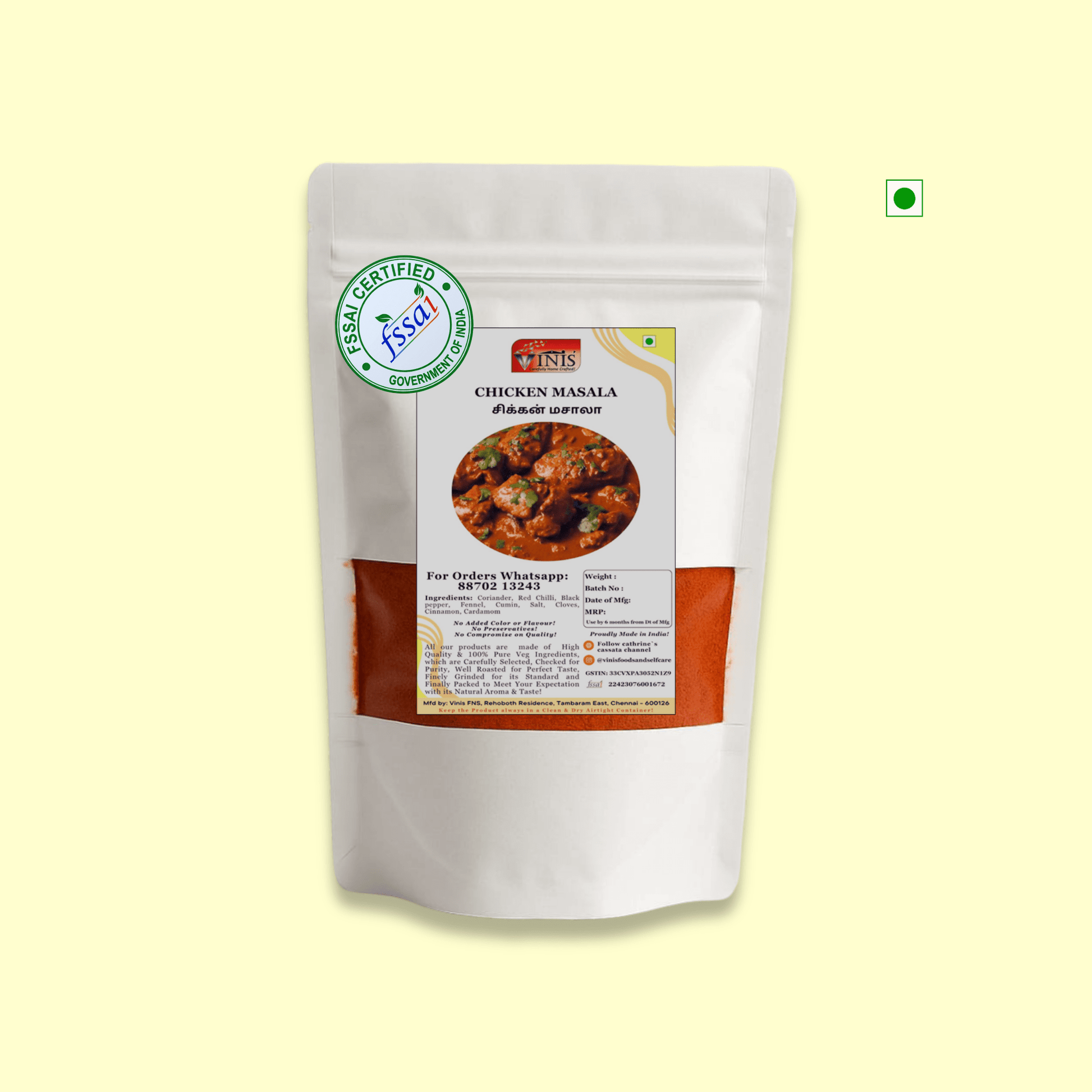 VINIS Chicken Masala Powder is a rich and aromatic spice blend specially crafted to enhance the flavor of chicken curries and gravies. Made with carefully selected spices, it adds depth, color, and authentic taste — helping you cook delicious, homestyle chicken dishes with ease.