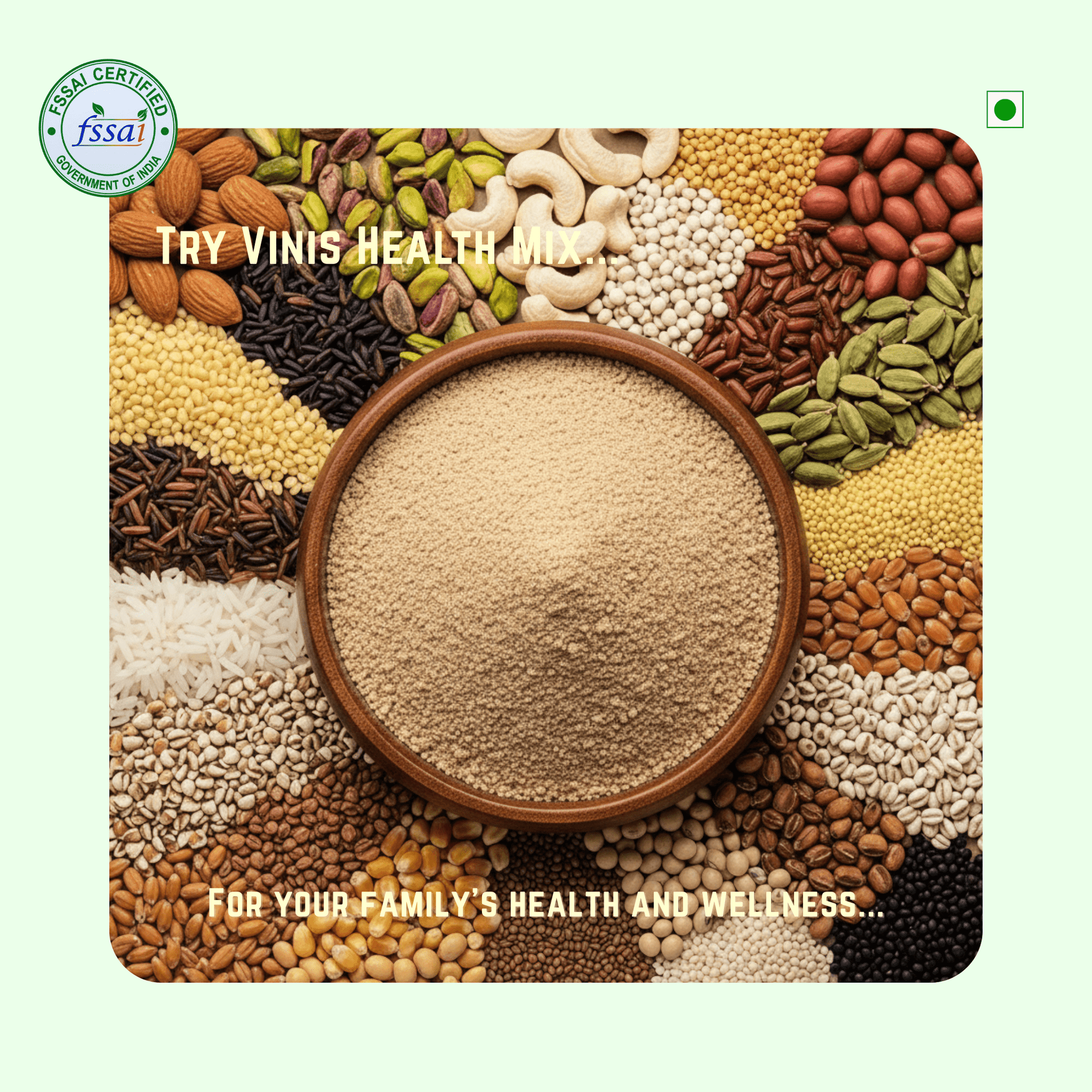 VINIS Natural Health Mix Powder is a wholesome blend of nutrient-rich nuts, traditional millets, and power-packed cereals. Inspired by age-old recipes, this mix is crafted to provide complete nutrition for growing kids, busy adults, and elders. With high protein, fiber, and essential vitamins, it is a natural way to boost energy, strengthen immunity, and support overall wellness — without any artificial additives.