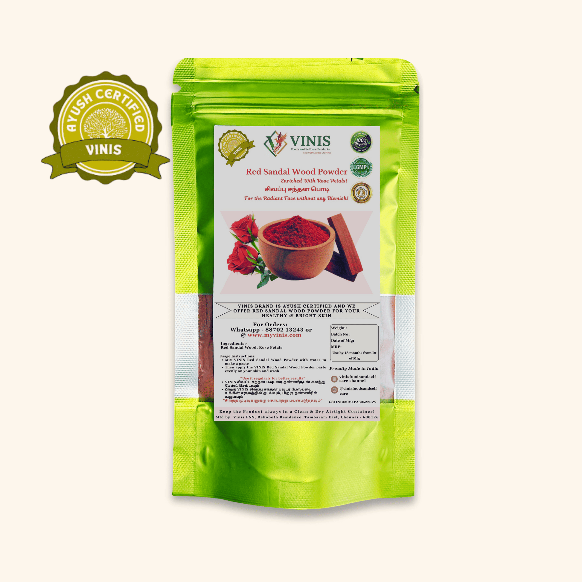 - Take 1–2 teaspoons of VINIS Red Sandalwood Powder.