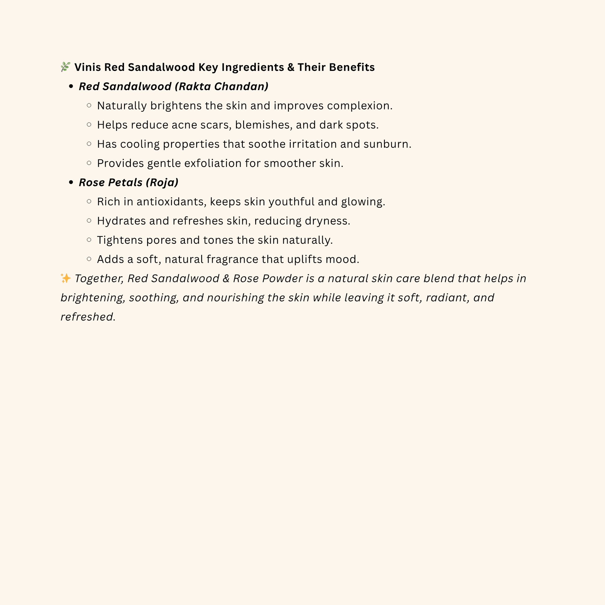 VINIS Red Sandalwood Powder is a pure and natural skincare essential made from the heartwood of red sandalwood trees. Known in Ayurveda for its cooling, healing, and beautifying properties, it helps brighten the complexion, reduce blemishes, and maintain youthful, radiant skin. Free from chemicals and additives, it’s safe for regular use on all skin types.