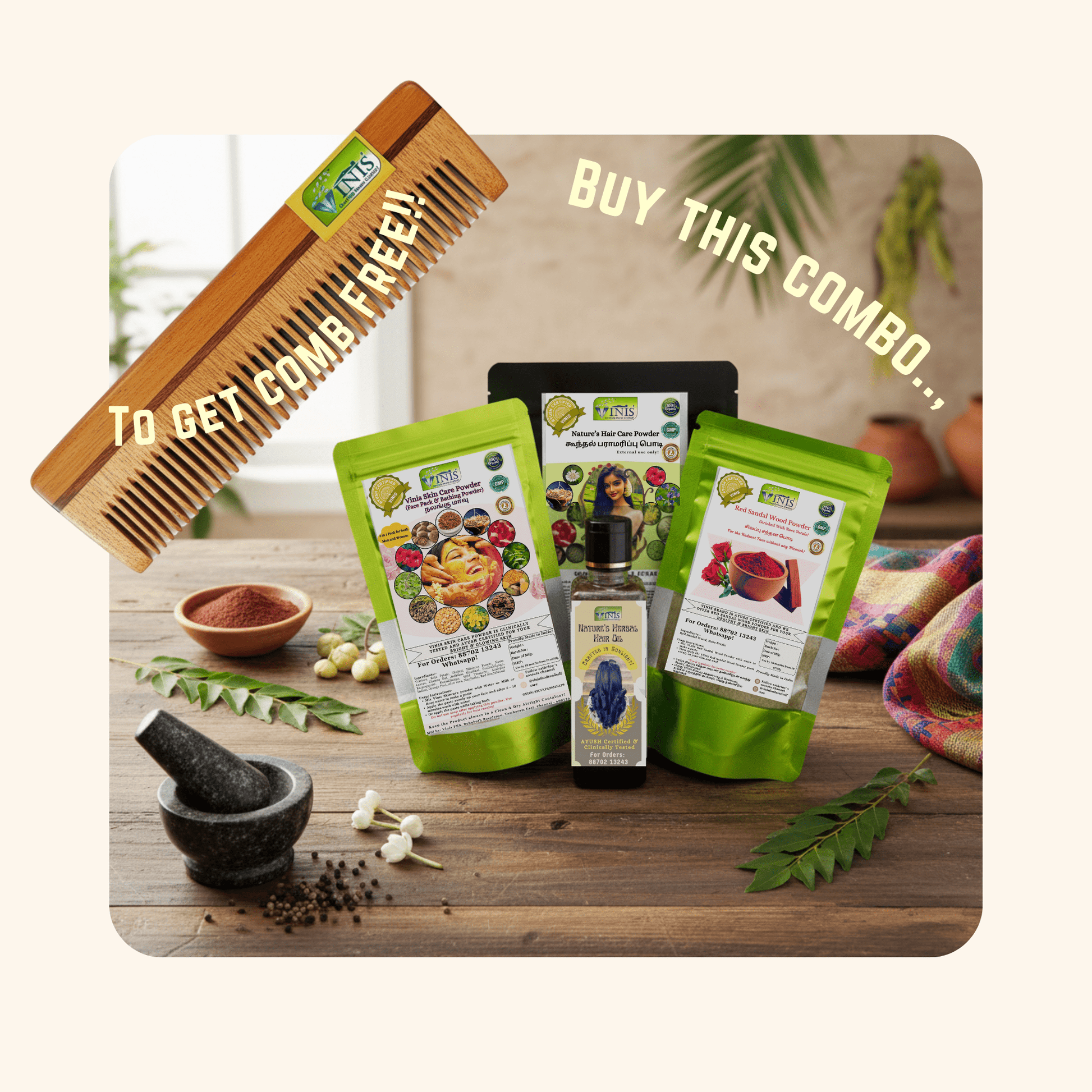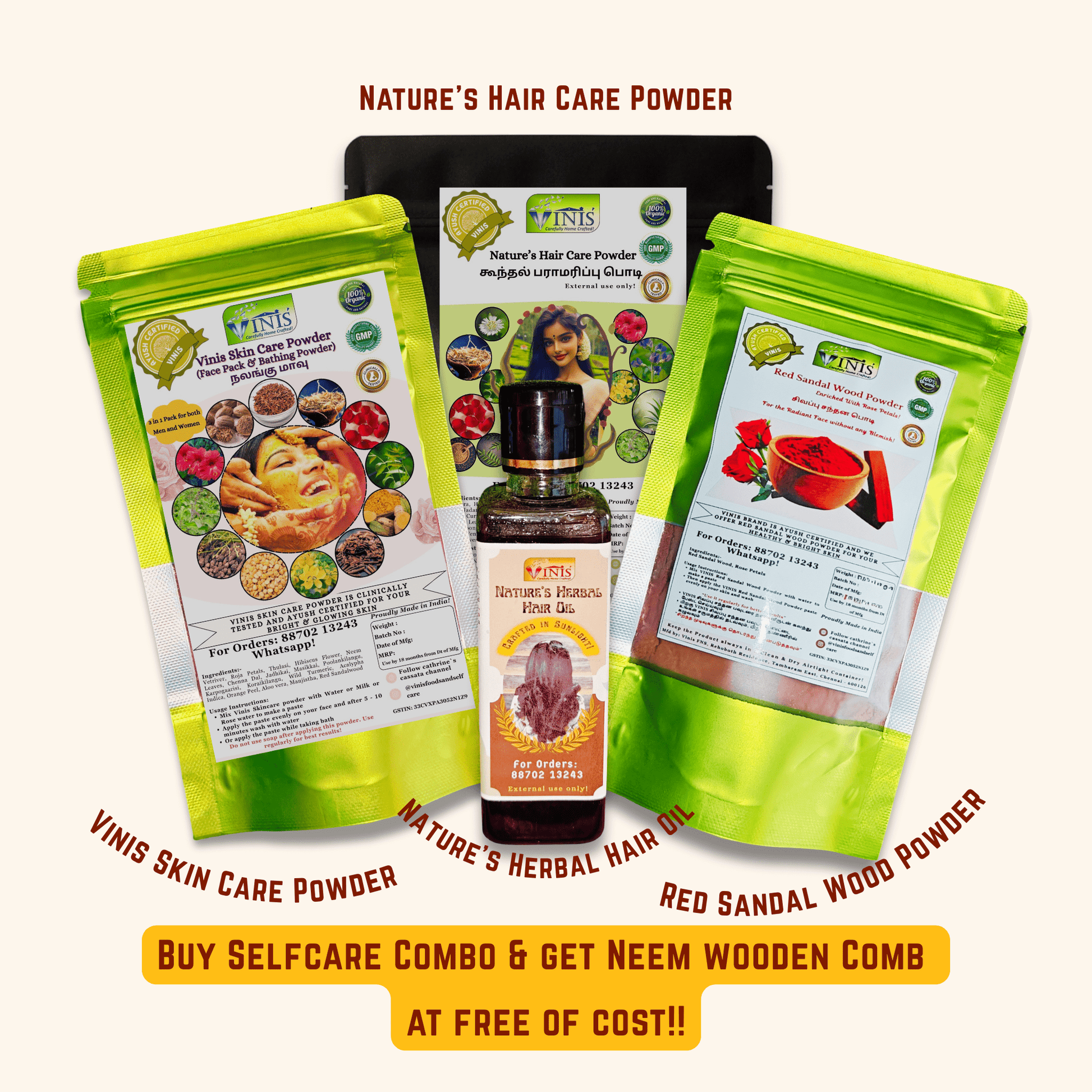 (Skin Care Powder 50 gm + Hair Care Powder 50 gm + Red Sandalwood Powder 50 gm + Herbal Hair Oil 50 ml) **Free Vinis Neem Wooden Comb!**