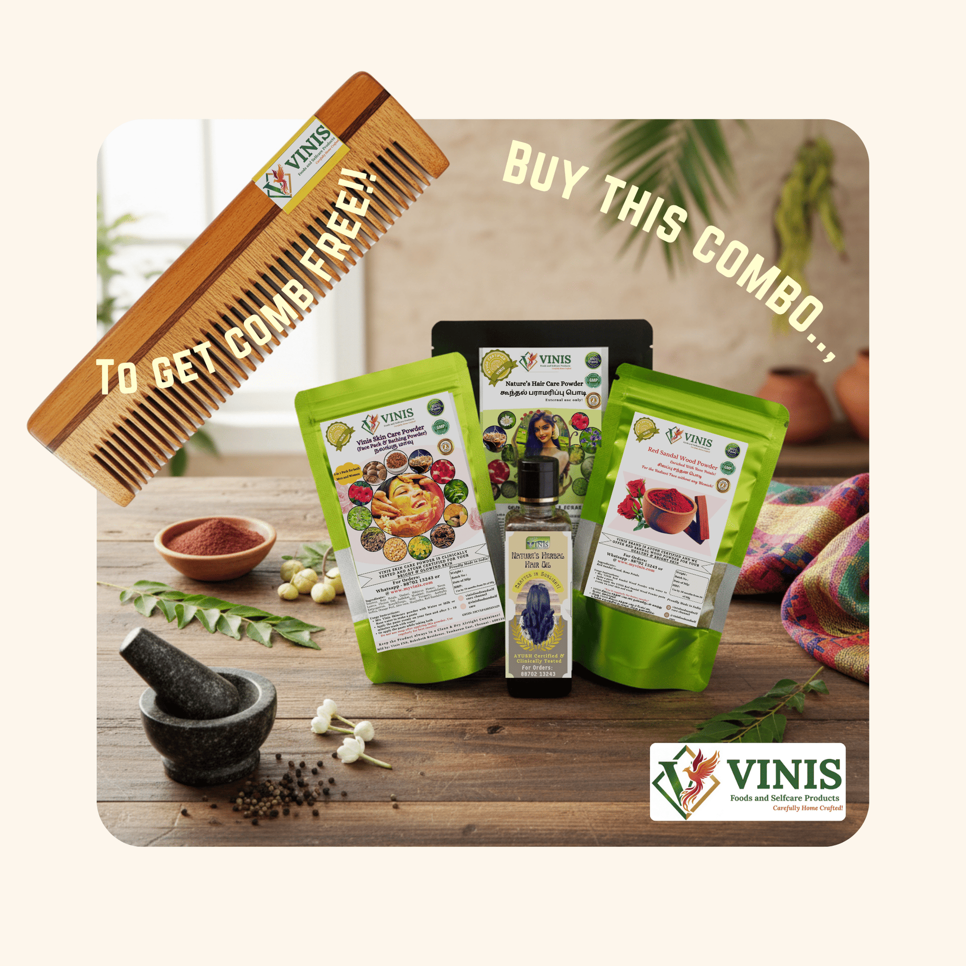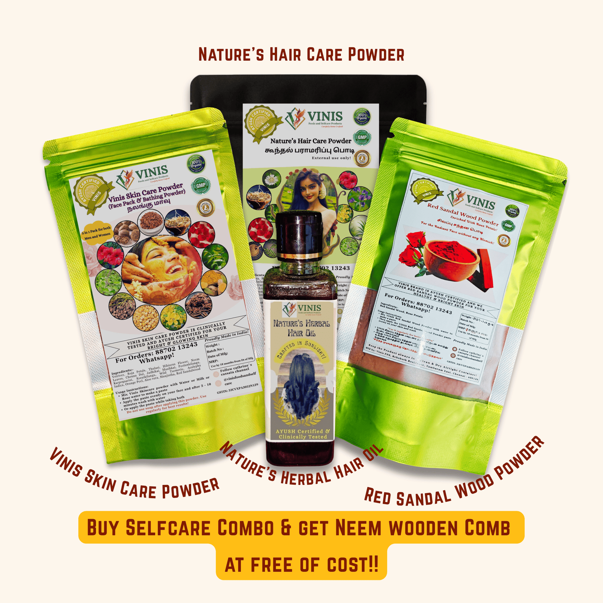 (Herbal Bath Powder (Skin Care Powder) 50 gm + Hair Care Powder 50 gm + Red Sandalwood Powder 50 gm + Herbal Hair Oil 50 ml) **Free Vinis Neem Wooden Comb!**